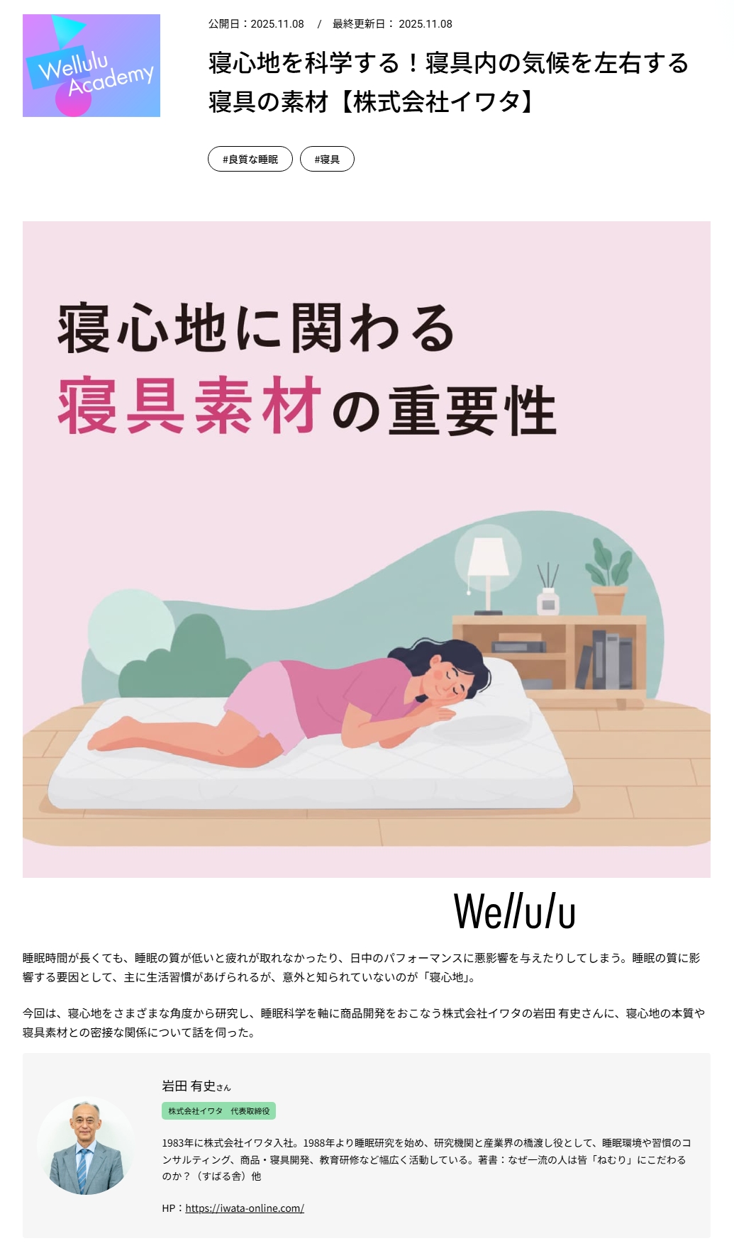 「寝心地を科学する!寝具内の気候を左右する寝具の素材」()をテーマに、“寝心地に関わる素材の重要性”についてお話ししています。ぜひご覧ください。