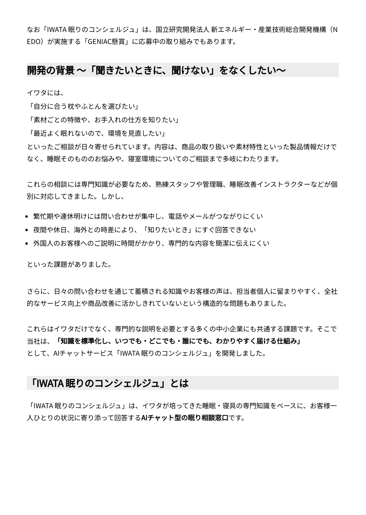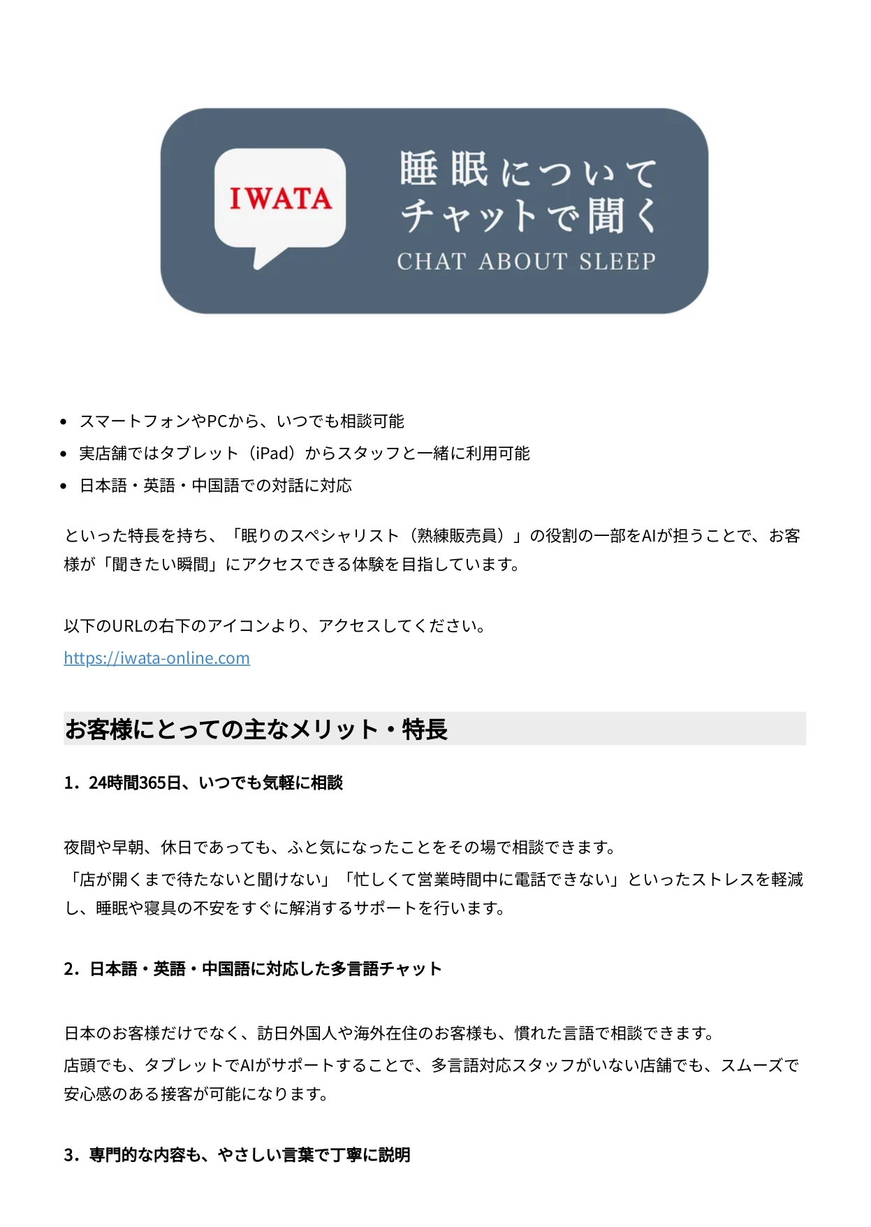AIチャット型の相談窓口「IWATA 眠りのコンシェルジュ」開始(24時間365日・多言語対応)