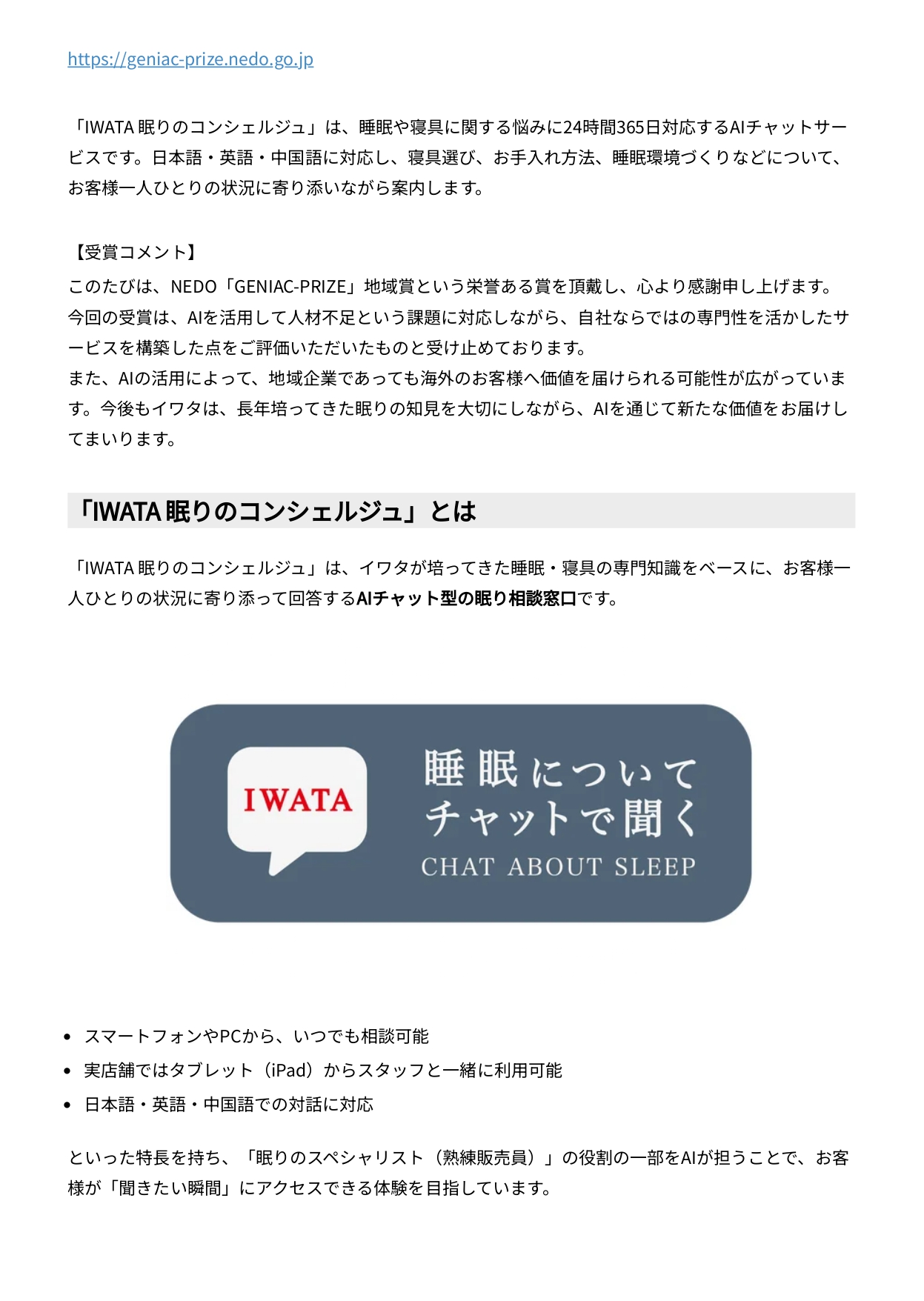 「IWATA 眠りのコンシェルジュ」が NEDO「GENIAC-PRIZE」地域賞を受賞